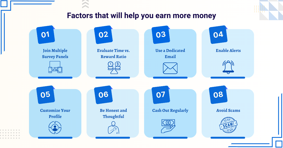 Taking online surveys can be an ideal method of earning extra money if you approach it strategically. To enhance your earnings, you must join multiple survey panels and pay attention to the time versus reward ratio to make sure the time you invest is aligned with the payment provided. Let us have a closer look at a few other factors that will help you earn more money.